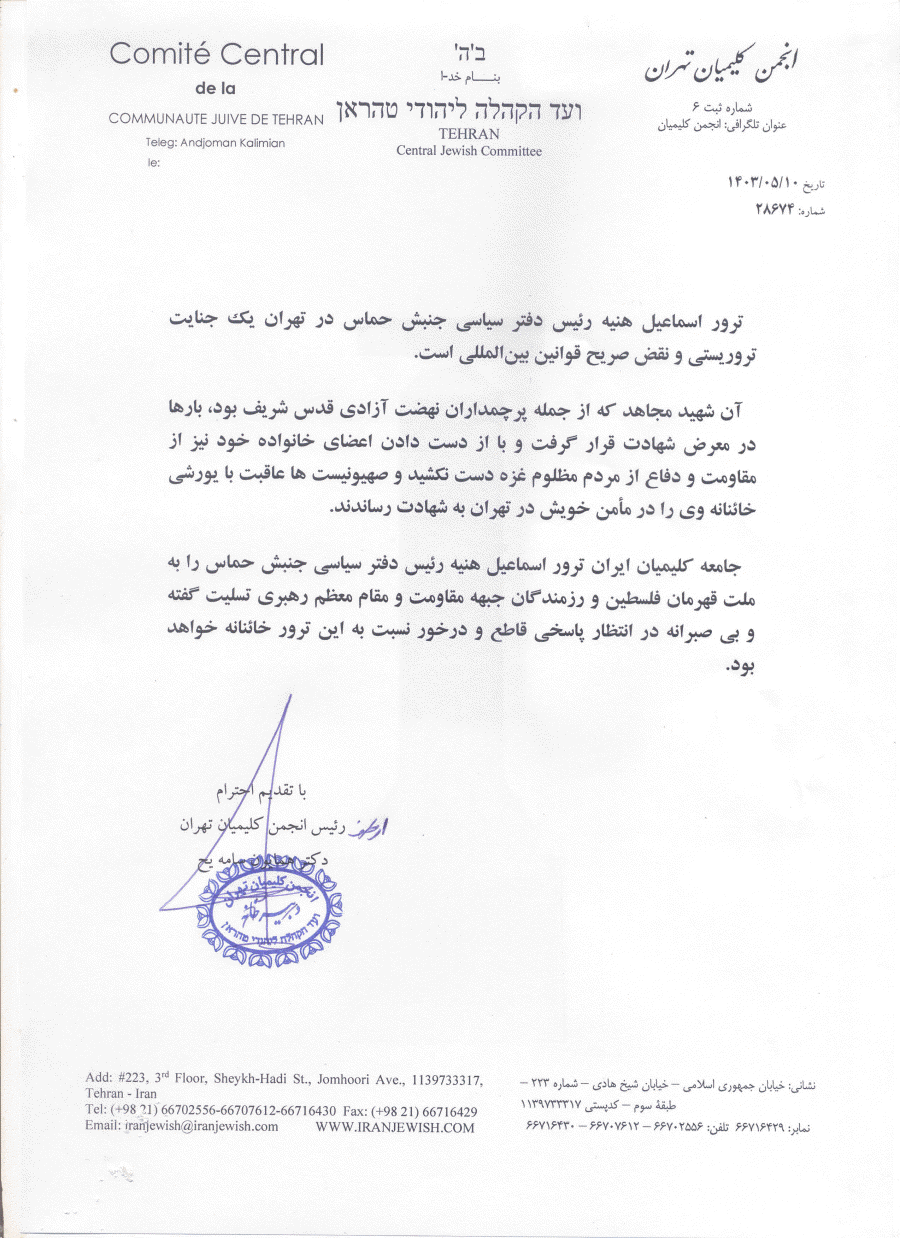محکومیت ترور اسماعیل هنیه رئیس جنبش حماس در تهران از طرف انجمن کلیمیان تهران