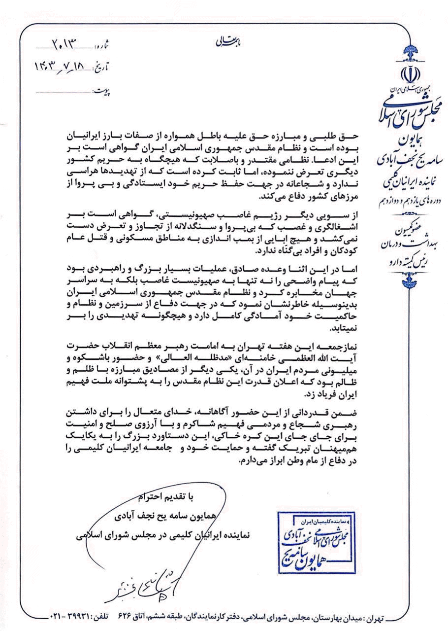 بیانیه دکتر همایون سامهیح، نماینده ایرانیان کلیمی در مجلس شورای اسلامی، در رابطه با عملیات وعده صادق٢