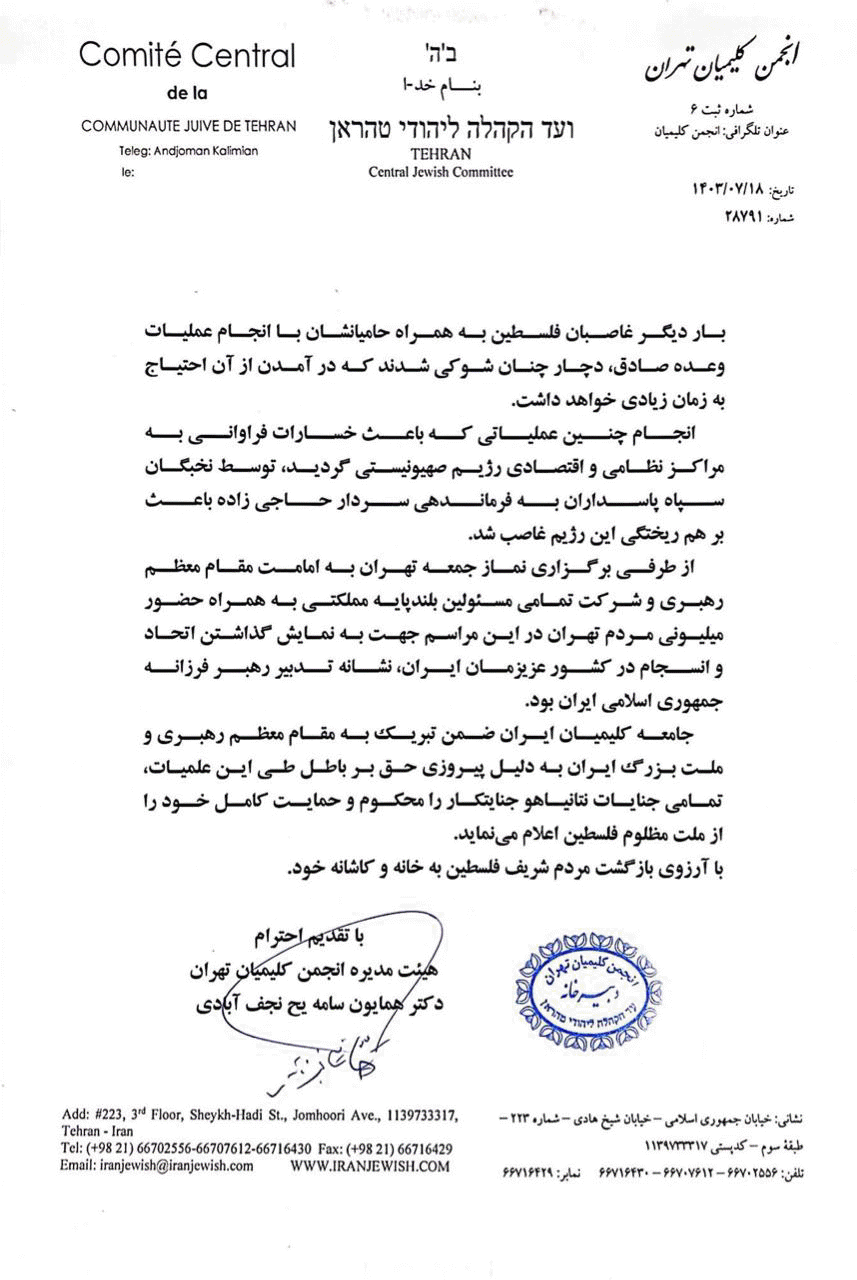 نامه انجمن کلیمیان تهران در خصوص عملیات وعده صادق ۲