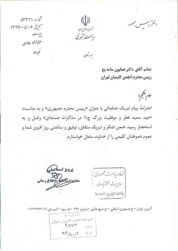 پاسخ نهاد ریاست جمهوری به انجمن کلیمیان تهران