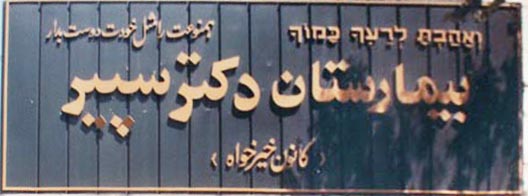 روی سر در بیمارستان با دو زبان عبری و فارسی نوشته شده: «همنوعت را مانند خودت