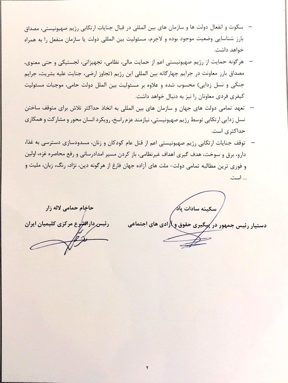و توقف جنایات رژیم صهیونیستی اعم از قتل عام کودکان و زنان و هدف قرار گرفتن