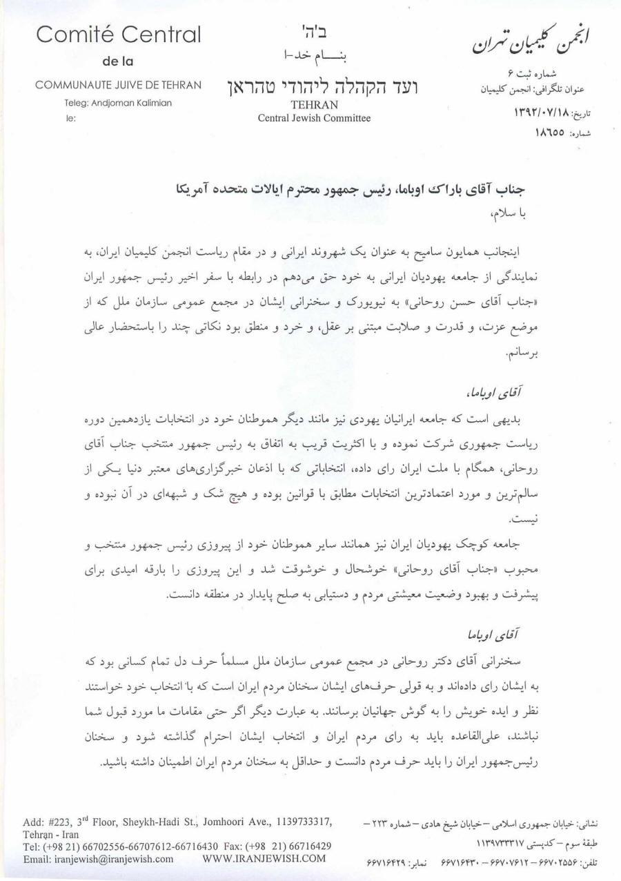 نامه رییس انجمن کلیمیان تهران در حمایت از دولت روحانی و اعتراض به سخنان نتنیاهو