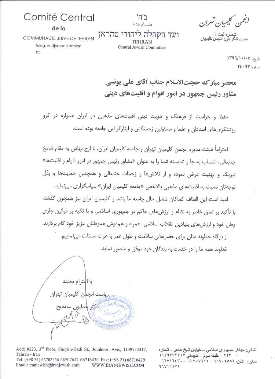 تبریک انجمن کلیمیان محضر حجت السلام جناب آقای یونسی مشاور ریس جمهور در امور اقلیتها