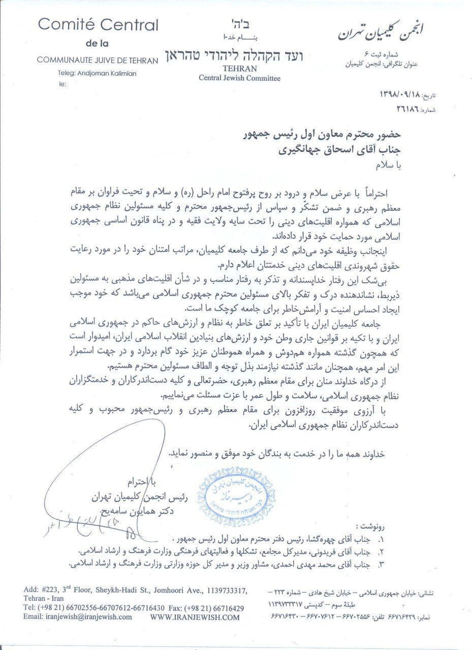 همیشگی کلیمیان را در انجام وظایف شهروندی خود یادآور شد و بر لزوم حفظ حقوق