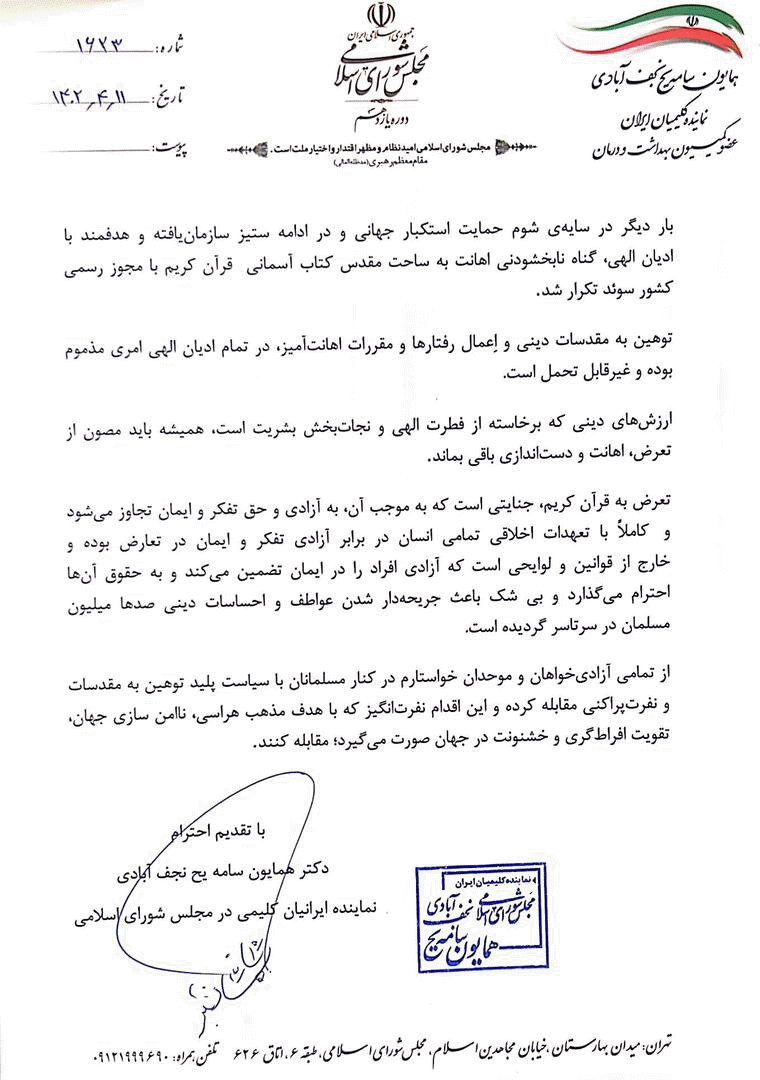 اوایل تیرماه، همایون سامه‌یح نجف آبادی، نماینده کلیمیان در مجلس شورای اسلامی، در گفت‌وگو با ایکنا، درباره دلایل غیر قابل توجیه بودن نسبت میان آزادی بیان با قرآن‌سوزی و توهین به مقدسات ادیان الهی از سوی مقامات غربی گفت: اتفاق قرآن‌سوزی در سوئد از هر منظر، اقدامی کاملاً زشت و غیر قابل قبول است. از نظر خود متفکران و اندیشمندان غربی دموکراسی و آزادی بیان احترام به همه تفکرات و عقاید تا جایی است که به کسی آسیب وارد نکند و هر تفکری که ارزش‌های دیگران را مورد هجمه قرار ندهد، مورد احترام است.