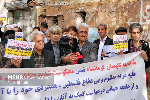 کلیمیان کرمانشاه با تجمع مقابل کنیسه ی وحدت با سردادن شعارهایی اعتراض خود را علیه جنایات رژیم صهیونیستی فریاد زدند. به گزارش ایسنا، حاضران در این تجمع اعتراضی با در دست داشتن دست نوشته‌ها و پلاکاردهایی با مضامینی شامل«به نام یهودیت جنایت نکنید»، «حساب یهودیت از صهیونیسم جدا است»، «ماخواستار آتش‌بس فوری هستیم» و «ما هرگونه کشتار کودکان، زنان و افراد بی دفاع را محکوم می‌کنیم» جنایات رژیم اسراییل را محکوم کردند. کلیمیان استان کرمانشاه همچنین با در دست داشتن دست نوشته هایی با مضمون «باید حضور فساد برانگیز آمریکا در منطقه برچیده شود» خواستار حذف دخالت های آمریکا در امور دیگر کشورها شدند.