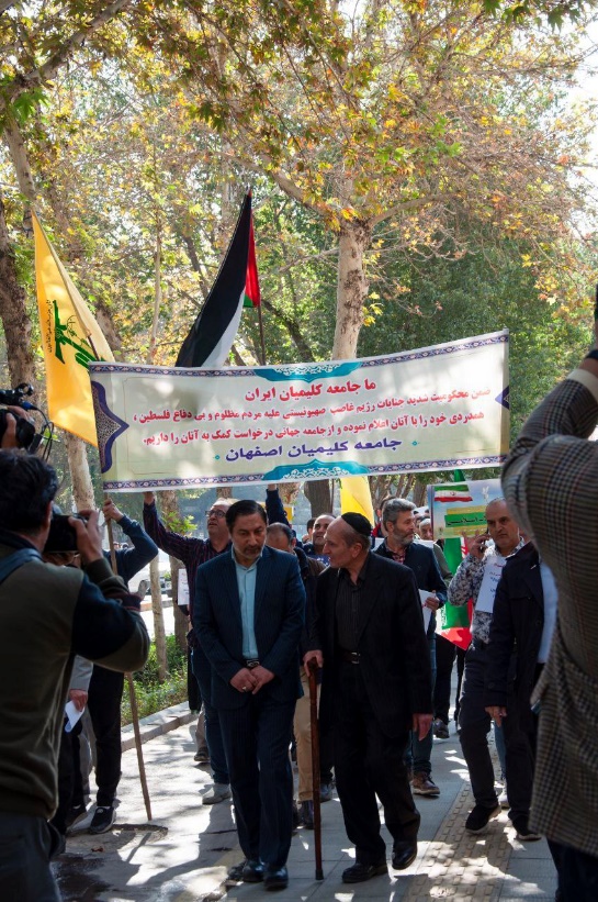 در پلاکارد دیگری که تعدادی از تجمع کنندگان در دست داشتند آمده بود: «ما جامعه ی کلیمیان ایران ضمن محکومیت شدید جنایات رژیم غاصب صهیونیستی علیه مردم مظلوم و بی‌دفاع فلسطین، همدردی خود را با آنان اعلام نموده و از جامعه ی جهانی درخواست کمک به آنان را داریم».