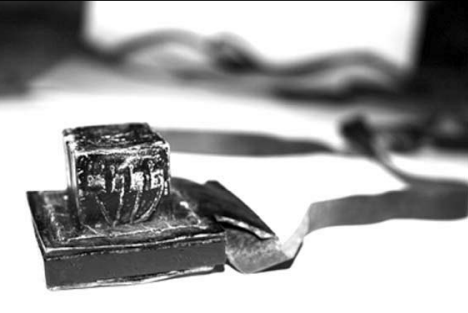تورات است. قبل از قرار دادن آیههای نوشته شده بر پوست، در جعبهی مکعبی شکل
