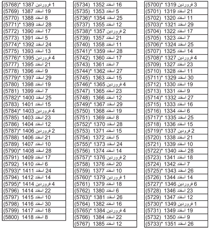 جدول تاریخ وقوع پوریم در یک دوره 100 ساله